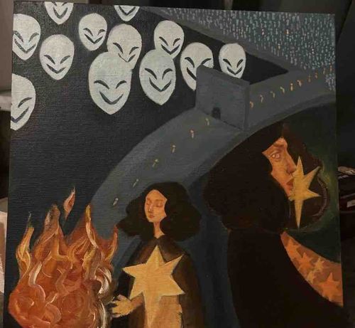 This is an original painting, likely acrylic or oil on a stretched canvas with a visible textured grain. The artwork features a complex surrealist or contemporary folk-art composition. In the foreground, two female figures with dark hair and stylized features are depicted; one appears with closed eyes holding a large yellow star-like shape, while the other is seen in profile with a similar star near her face. To the left, a vibrant orange and yellow flame is depicted with expressive brushwork. The center of the piece shows a large, arched blue architectural structure resembling a bridge or a wall with small glowing windows. Above this, a dark sky is populated by several floating, pale white masks or faces with minimalistic black facial features. The background includes a stippled or pointillist area representing distant lights or a crowd. The color palette is dominated by dark blue, black, and earthen tones, contrasted by the bright yellows of the stars and intense oranges of the fire. The brushwork shows varied techniques, from smooth blending on the faces to more impasto applications in the flames and architectural textures. There are no visible signatures or maker's marks on the front surface. The condition appears fair, though there is some slight surface dust and potential edge wear common with unframed pieces. The style suggests a late 20th or early 21st-century contemporary piece, possibly by an emerging artist or a high-quality student work.