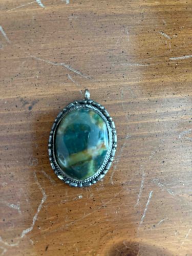 Vintage Oval Moss Agate or Jasper Pendant in Silver-Tone Bezel
