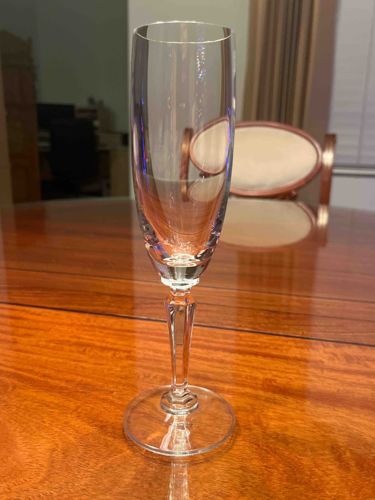 This is a contemporary fine crystal champagne flute characterized by its elegant, slender profile. The glassware is constructed from high-clarity lead or lead-free crystal, exhibiting a clear, colorless transparency that suggests a high manufacturing standard. The piece consists of a deep, cylindrical flute-shaped bowl with a slightly tapered rim to concentrate carbonation and aromatics. The bowl transitions via a clean join to a multi-faceted, hexagonal-cut tapered stem. This architectural stem adds a geometric contrast to the smooth curves of the bowl and features a central knop for balanced handling. The stem terminates in a circular, flat foot with a polished edge. In terms of condition, the glass appears to be in excellent used condition with no visible chips, cracks, or 'clouding' from dishwasher use. There are no obvious maker's marks visible in the photograph, though high-end makers like Waterford or Schott Zwiesel often use acid-etched marks on the base. The style is late 20th to early 21st-century modern, emphasizing minimalist elegance and geometric stemware trends. The thinness of the rim and the precise faceting on the stem serve as indicators of quality craftsmanship.