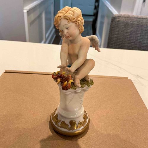 This is an authentic Italian porcelain figurine produced in the Capodimonte style, commonly associated with manufacturers like Giuseppe Cappe or Ginori during the mid-20th century. The piece features a seated, naked putto or cherub with small wings, leaning forward to warm its hands over a stylized campfire of red and orange flames atop a pedestal. The sculpture is rendered in fine-grain porcelain with a characteristic matte 'bisque' finish on the cherub's skin and hair, while the pedestal base features white glazing and hand-painted gold gilt accents. The cherub has delicately modeled strawberry-blonde hair and soft facial features, demonstrating high-quality craftsmanship in the anatomical proportions and expressive posture. The base is an ornate, rococo-style white column with gold-trimmed scrollwork. Regarding condition, the piece appears well-preserved for its 1974 purchase date; however, detailed inspection of the delicate wing tips and the pointed 'flame' elements is necessary as these are prone to small chips. The gold gilding on the base shows minor age-related patina but remains largely intact. This style of Neapolitan porcelain is highly collectible and exemplifies the mid-century Italian revival of 18th-century decorative arts.