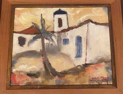 This is an original oil (or heavy acrylic) painting on canvas or board by the renowned Brazilian artist José de Dome (1921-1982), titled 'Torre da Igreja de São Benedito'. The work belongs to the Expressionist style, characterized by spontaneous, thick brushwork and a muted yet evocative color palette of ochres, whites, earthy browns, and a singular pop of blue on the church dome and shutters. The composition features a colonial-style church tower rising behind white-washed walls, flanked by a stylized, lean palm tree that grounds the foreground. The execution shows deliberate, broad strokes that convey texture and movement, particularly in the sky and the ground. The piece appears to be signed and dated in the lower right corner, likely consistent with de Dome’s mid-20th-century period (circa 1960s-1970s). It is housed in a contemporary wooden stepped frame with a gilded inner liner. The condition shows minor surface grime and potential slight yellowing of the varnish consistent with age, but the impasto remains crisp and the substrate appears stable without visible cracking or loss. The craftsmanship is high, reflecting de Dome’s mastery in blending Brazilian regionalism with modern European expressionist techniques.