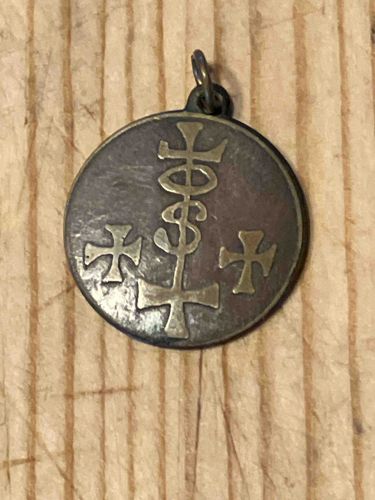 This is a circular, talismanic pendant likely constructed from a base of copper or a copper-alloy such as bronze. The item features a flat, disc-shaped body with a single integrated bail attached to a simple jump ring at the top. The central design is rendered in a lighter, brass-toned metal, possibly as an inlay or through selective plating/cleaning of the raised relief. The iconography consists of a central vertical staff or sigil topped with a flared cross, an 'S' shape entwined around the center, and a horizontal bar at the base. It is flanked by two smaller crosses pattée on either side. These symbols are highly characteristic of esoteric, occult, or fringe religious groups, specifically evoking Rosicrucian or Hermetic imagery. The surface shows a deep, dark brown oxidation and patina, consistent with aged copper, with visible surface pits and granular wear suggesting significant age or exposure to the elements. There is no visible maker's mark or hallmark on the obverse face. The craftsmanship appears to be folk-art or small-batch production rather than high-end jewelry, given the slightly irregular edges of the central symbols. The piece likely dates from the late 19th to the mid-20th century, a period of heightened interest in Western esotericism.