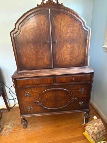 This piece of furniture is a two-piece sideboard or buffet set in a transitional style, likely dating from the 1920s to 1940s. It features a top hutch section distinguished by a high, bell-shaped arch and book-matched walnut burl veneers on the double doors, topped with a scrolled decorative crest. The base consists of two shallow drawers over two large, deep drawers. The large lower drawers are unified by a central oval medallion with carved foliate flourishes and floral-shaped metal pull handles. The construction showcases typical Revival-era craftsmanship, utilizing figured walnut veneers over a secondary wood frame. The legs are turned in a bulbous, trumpet-like fashion with integrated casters. Condition-wise, the piece shows significant signs of age and use: there is visible surface wear, scratches, and finish loss along the horizontal shelf of the base and on the feet. The patina is uneven, particularly on the base where dust and moisture may have affected the varnish. No maker's mark is visible from the exterior, but the style is characteristic of American mass-produced fine furniture from the Depression era.