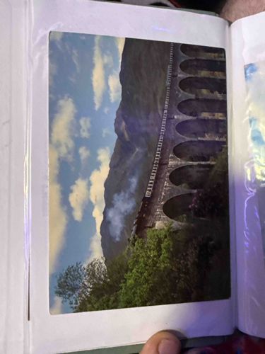 This is a rectangular photo-representative postcard featuring the Glenfinnan Viaduct in the Scottish Highlands. The image is oriented vertically (though the scene itself is a landscape) and depicts the iconic multi-arch curved bridge set against a backdrop of steep hills and a partly cloudy blue sky. In the foreground, green deciduous trees frame the lower section of the masonry structure. A notable feature is a slight plume of smoke or steam rising from the viaduct, likely indicating the passage of a steam train. The postcard appears to be a modern-era color print, probably late 20th or early 21st century, with vibrant saturation and high-gloss finish characteristic of commercially produced tourist souvenirs. It is currently housed in a plastic protective sleeve within a photo album, which has helped preserve its condition. There are no visible tears, creases, or light-fading visible on the front surface. The composition utilizes a wide-angle perspective to capture the scale of the 21 arches. While no specific maker's mark is visible through the sleeve, the quality suggests professional lithographic or digital printing typical of Scottish tourism board or heritage site merchandise.