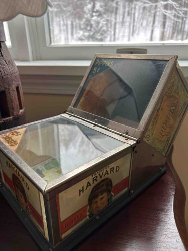 Glass and metal cigar dispenser 5 cents Pippin’s 10 cents Harvard. Propert of H Traiser & Co on back