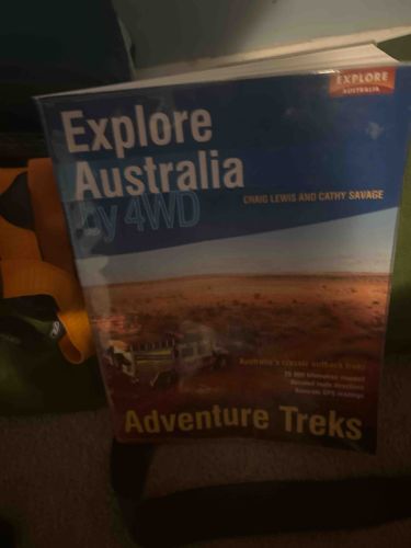 This is a softcover non-fiction guidebook titled 'Explore Australia by 4WD: Adventure Treks' authored by Craig Lewis and Cathy Savage. The book features a multi-colored pictorial cover showcasing an outback landscape with a 4WD vehicle, published under the 'Explore Australia' imprint. Physically, the book appears to be a thick, trade paperback with a glossy finish. The cover design utilizes blue, white, and red typography against a background photograph of reddish-brown desert terrain. Notable features include mentions of mapped routes, GPS readings, and classic outback treks spanning 25,000 kilometers. The condition of the book shows some visible wear, including corner bumping and slight curling of the front cover edges, typical of a field guide intended for use. The binding appears intact but shows signs of being well-read. Given the authors and series, this title likely dates to the early 21st century, representing a high-quality production with comprehensive cartographic data for off-road enthusiasts. The craftsmanship is standard for modern publishing, utilizing standard offset printing on likely high-grade paper designed for durability in travel conditions.