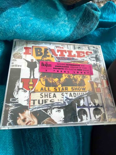 This item is a commercially produced double Compact Disc (CD) set titled 'Anthology 2' by the legendary British rock band, The Beatles. Released in March 1996 as the second installment of a three-part series, the set is housed in a standard 'fatboy' or double-jewel case constructed of clear and grey injection-molded plastic. The cover art features a distinctive collage designed by artist Klaus Voorman, which includes elements of the band's history such as the 'Help!' silhouettes, Shea Stadium posters, and torn imagery from previous album covers like 'With The Beatles' and 'Beatles for Sale.' A notable feature is the presence of the original vibrant pink hype sticker adhered directly to the front of the plastic case. This sticker advertises 'Alternative and unreleased versions of your favorite hits plus the new single Real Love.' The sticker also displays the catalog code CDP 7243 8 34448 2 3. Physically, the jewel case shows minor signs of shelf wear and light surface scratching common for an item of this age, but the underlying paper artwork remains sharp with high saturation in the reds and yellows. No major cracks are visible in the plastic housing. As a mid-90s production, it represents a significant historical era of Beatles archival releases, manufactured by Apple Corps Ltd./Capitol Records.