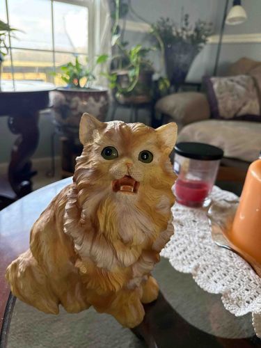 This item is a vintage-style ceramic or cold-cast resin figurine of a long-haired cat, likely modeled after a Persian or Himalayan breed. The piece features a distinctively expressive face with an open mouth, showing teeth and a pink tongue in a meowing or startled pose. Its coat is rendered in a warm ginger and cream palette with deeply molded fur texture, suggesting a high level of detail in the casting mold. The eyes are painted a striking green with dark pupils, providing a lifelike quality. Standing approximately 6 to 8 inches high, the figurine is seated in an upright position with its tail tucked around its paws. The construction appears sturdy, with a matte or satin finish that emphasizes the sculptural planes of the fur. Regarding condition, there are no immediate signs of chips or cracks visible in the primary structure, though the paint shows slight thinning at the tips of the ears and around the base, consistent with a vintage item from the late 20th century. No specific maker’s marks are visible on the front, but the style is reminiscent of companies like Sandicast or Homco. The craftsmanship manages to balance the caricature-like expression with a realistic anatomical representation of feline anatomy.
