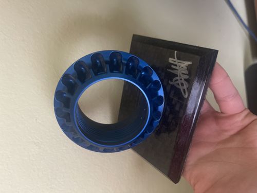 This item is an authentic Formula One wheel nut, finished in a vibrant cobalt blue anodized coating, mounted onto a high-gloss carbon fiber presentation plaque. The wheel nut features a classic splined or fluted design typical of rapid-change F1 pit stop hardware, with internal threading visible within the center bore. The anodized finish is largely intact, showing high-quality machining with smooth, beveled edges. The carbon fiber base displays a distinct woven pattern and is coated in a thick, protective clear resin. A notable feature is a silver-toned hand-written autograph on the right side of the plaque, though the specific driver's identity would require further authentication. The piece measures approximately 4 to 5 inches square at the base. Condition appears excellent with minimal surface micro-scratches on the resin and no visible chipping to the blue anodization. This represents contemporary motorsport memorabilia, likely from the late 2010s to early 2020s era. The craftsmanship reflects the high-precision engineering standards of elite racing components, converted here into a decorative commemorative piece.