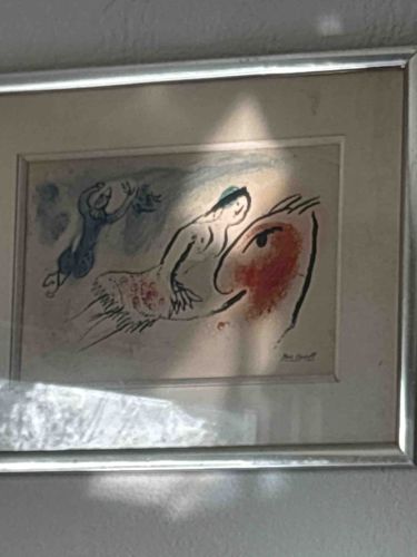 This item is a framed color lithograph attributed to the renowned Belarusian-French artist Marc Chagall, likely dating from the mid-20th century (circa 1950s-1960s). The artwork depicts quintessential Chagall motifs, featuring a central figure of a rider on a horse, accompanied by a floating secondary figure reminiscent of a circus performer or angel. The composition is executed in a dreamlike, surrealist style with fluid black outlines and wash-like applications of primary colors, specifically reds and blues, against an off-white or cream-colored paper ground. Notable features include a visible signature in the lower right corner, though its authenticity as a hand-signed piece versus a plate-signed reproduction requires physical verification. The piece is housed in a contemporary silver-toned metallic frame with a neutral-colored mat that shows some minor age-related discoloration. The condition of the paper shows signs of light toning or yellowing, common for prints of this age. Some surface dust is visible under the glass, and there is a noticeable glare on the glazing in the photograph. The craftsmanship reflects the early-to-mid 20th-century printmaking tradition, utilizing lithographic techniques to achieve soft, painterly gradients and expressive line work typical of the 'School of Paris' style.