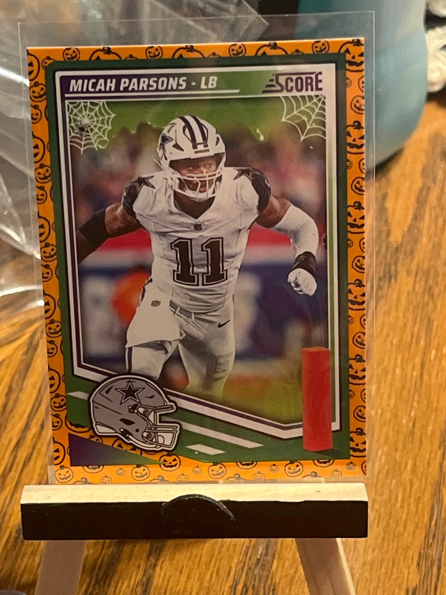 This is a 2023 Panini Score football trading card featuring Micah Parsons (Linebacker for the Dallas Cowboys). This specific card is the 'Spooky' or 'Halloween' parallel, distinguished by its unique thematic orange border adorned with various jack-o'-lantern illustrations. The card design includes spiderwebs in the upper corners and a stylized pylon in the foreground. Parsons is depicted in his Dallas Cowboys away white uniform with his number 11 clearly visible. The 'Score' brand logo is located in the upper right. Physically, the card has a standard 2.5 x 3.5-inch dimension with a glossy finish. It is currently housed in a clear protective penny sleeve, preserved on a small wooden easel for display. The centering appears slightly heavy toward the bottom and left borders. The corners show sharp manufacturing edges with no immediate signs of fraying or whitening from this perspective. There are no visible surface scratches or creases through the sleeve. The printing quality is consistent with modern high-volume sets, utilizing a CMYK process with vibrant orange and green hues. The Dallas Cowboys star helmet logo is positioned at the bottom left as a secondary design element.