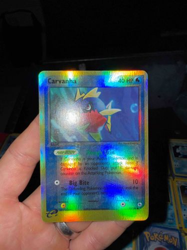 This is a 2003 Pokemon Trading Card Game card featuring the character Carvanha, numbered 51/109 from the EX Ruby & Sapphire expansion set. The card is a 'Reverse Holofoil' variant, distinguished by the holographic foil treatment applied to the card body rather than just the character artwork window. It measures approximately 2.5 by 3.5 inches and is constructed from multi-layered cardstock. The artwork by Hajime Kusajima depicts Carvanha underwater with vibrant blue, red, and yellow tones. Notable features include the card's 'Poke-BODY' ability 'Rough Skin' and the 'Big Bite' attack. The card features the 'e-Reader' logo in the bottom left corner, indicating technical compatibility with the Nintendo Game Boy Advance accessory. Regarding condition, the card exhibits visible surface scratching and 'silvering' along the bottom edge where the foil is exposed. There is noticeable edge wear and slight whitening on the corners, common for cards of this age. The holographic refractive pattern retains a strong rainbow spectrum under direct light, though some surface clouding is present. This piece represents the early 'EX' era of the franchise, marked by the transition of publishing rights to The Pokemon Company International.