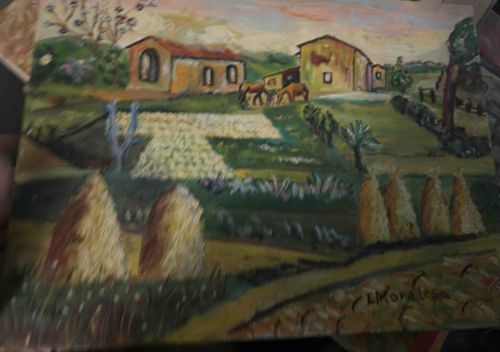 This is a rectangular oil or acrylic landscape painting on canvas or board, executed in a post-impressionist or folk art style. The composition depicts a rural farmstead featuring two primary yellow-ochre buildings with terracotta-tiled roofs, set against a rolling green hillside under a pale, hazy sky. Two brown horses or mules are grazing in the middle ground. The foreground is dominated by various agricultural elements, including distinct haystacks (ricks) on the left and right, and a large white rectangular patch that may represent laundry drying on the grass or a specific crop field. The color palette is earthy and warm, utilizing greens, ochres, browns, and soft blues. The brushwork is thick and gestural, showing visible texture and impasto. The painting is signed 'L. Morales' in the lower right-hand corner in a dark pigment. The overall condition appears stable, though there is some slight blurring in the photograph, and the edges show typical wear for an unframed piece from the mid-to-late 20th century. The quality of light and simplified geometric forms of the buildings suggest influence from early 20th-century European landscape traditions, possibly Spanish or Latin American in origin. There are no obvious signs of restoration, though some minor paint loss or abrasions may be present along the extreme periphery of the support.