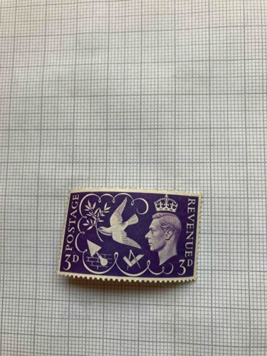 This is a single horizontal-format postage and revenue stamp from Great Britain, issued on June 11, 1946, to commemorate the end of World War II. The stamp is printed in a deep violet (purple) ink on cream-colored paper. The design features a profile portrait of King George VI facing left, topped with a crown. To the left of the King, there is symbolic imagery including a dove of peace carrying an olive branch, a bricklayer's trowel, and a square and compass (symbols of reconstruction and Freemasonry-inspired craftsmanship). The text 'POSTAGE' and 'REVENUE' runs vertically on the left and right sides, with the denomination '3D' shown in the lower corners. The stamp is perforated on all four sides, though it appears slightly curved in the image. The condition shows no visible cancellation marks (mint condition), though there is slight tonal yellowing of the paper consistent with age. This issue was designed by Reynolds Stone and represents the 'Peace and Reconstruction' series. The craftsmanship of the photogravure printing is sharp, with fine detailing in the feathers of the dove and the hair of the monarch.