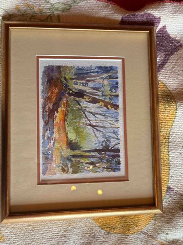 This item is an original watercolor painting on textured paper, featuring an impressionistic woodland scene. The composition utilizes a palette of deep indigos, ochre, burnt sienna, and moss greens to depict sun-dappled trees in a forest setting. The painting demonstrates expressive brushwork and wet-on-wet techniques characteristic of late 20th-century landscape art. It is housed in a professional double-matting arrangement consisting of a cream-colored outer mat with a subtle texture and a thin burnt-orange inner fillet that provides a pop of color echoing the landscape's warm tones. The artwork is protected under glass and set within a thin, metallic gold-finished wooden frame. The frame shows minor surface handling wear but remains structurally sound. While no signature is immediately visible through the matting, the confident application of pigment suggests a practiced hand. The overall aesthetic is one of serene naturalism, likely dating from the 1980s to the present. The paper appears heavy-weight with deckled edges visible at the margins, indicating high-quality watercolor stock. No foxing or significant fading is visible on the artwork itself, though light reflections on the glass indicate it is currently in a domestic environment.
