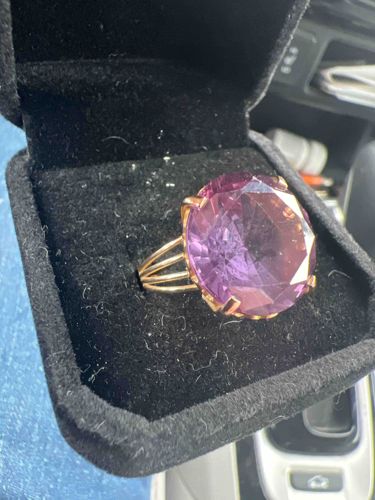 This is a statement cocktail ring featuring a very large, round brilliant-cut gemstone. The stone exhibits a deep purple to pinkish-lavender hue, characteristic of amethyst or synthetic color-change alexandrite, which was common in mid-20th-century jewelry. The gemstone is held in an open-back yellow gold setting with eight substantial prongs securing the girdle. The band (shank) features a distinctive split or triple-wire design that tapers as it moves away from the head of the ring, a style often associated with Retro or mid-century modern eras (circa 1940s-1960s). The craftsmanship appears sturdy but utilitarian, typical of commercial fine jewelry from the mid-century period. Regarding condition, the metal shows minor surface scratches consistent with age and light wear. There is visible lint and dust on the stone and settling in the black velvet display box, which suggests the piece has been stored for some time. No significant chips or fractures are immediately visible on the crown facets, though a professional cleaning and loupe inspection would be required to confirm the integrity of the facet junctions and the girdle. There are no visible maker's marks or hallmarks from this angle, though they likely reside on the inner shank.