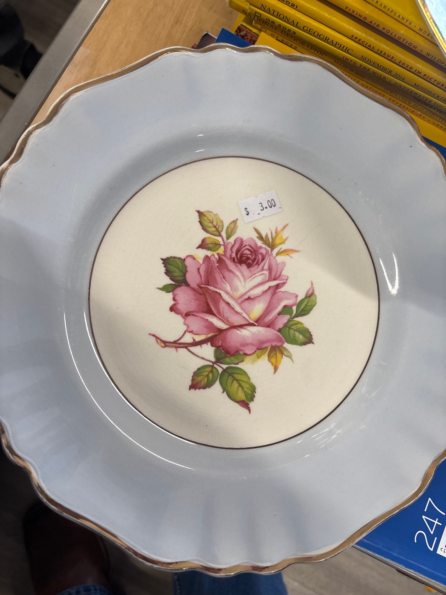 This is a circular porcelain or fine ceramic decorative plate featuring a prominent central floral motif of a pink 'Moss Rose' style cabbage rose. The plate's design includes a distinct two-tone glaze: a cream-colored center well contrasted against a pale powder blue wide rim. The rim is stylized with a scalloped or 'pie crust' edge, finished with a thin gilded gold band that shows significant signs of age and wear. The central graphic is a high-quality transfer print or lithograph with hand-painted accents, depicting various shades of magenta and blush pink in the petals, complemented by green leaves with yellowish undertones. Structurally, the plate appears to be a standard lunch or salad size, approximately 8 to 9 inches in diameter based on the scale of nearby objects. Regarding condition, there is visible rubbing and loss to the gold gilt on the scalloped edges, and the presence of a '3.00' adhesive price sticker suggests it is currently in a secondary retail or thrift environment. No significant cracks or chips are immediately visible from the top-down view, though fine surface crazing may be present in the glaze due to its estimated mid-20th-century age (circa 1940s-1960s). The style is indicative of European or American manufacturers such as Homer Laughlin or various Bavarian porcelain houses of that era.
