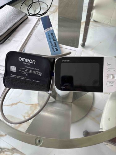 This is a contemporary Omron brand digital blood pressure monitor system consisting of an electronic base unit and an inflatable arm cuff connected by a flexible gray rubber air hose. The electronic base features a rectangular design with a large digital LCD screen housed in a black plastic bezel, flanked by a white control panel featuring physical buttons for memory, navigation, and a prominent 'Start/Stop' function. The associated cuff, model HEM-FL31, is constructed from durable black synthetic fabric with a nylon texture, featuring white screen-printed instructions and diagrams for proper anatomical placement on the upper arm. The cuff fits arm circumferences of approximately 22 to 42 cm. Manufacturing details printed on the cuff indicate it was produced by OMRON HEALTHCARE Co., Ltd., based in Kyoto, Japan, and manufactured in Vietnam. The device appears to be in very good, used condition with no visible tears in the cuff fabric, kinks in the air tubing, or significant scuffing on the screen. It represents a standard high-quality consumer-grade medical diagnostic tool manufactured within the last 5-10 years, designed for home health monitoring with an emphasis on user-friendly interface and precision.