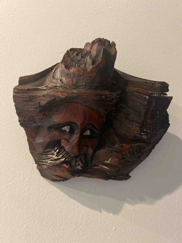 This unique folk art wall sculpture features a face carved directly into a natural wood burl or thick piece of timber. The piece is characterized by its high-relief style, where the facial features—specifically a man with a mustache—emerge from the rough, jagged texture of the surrounding wood. The material appears to be a dense hardwood, finished with a dark, lustrous stain that highlights the deep grains and natural fissures of the burl. The eyes are painted with white and black accents to give the figure expression, and a hint of red pigment is visible near the mouth area. The construction utilizes the organic shape of the wood, including a prominent upward grain growth at the top that acts as a natural crown or hat. The carving style is expressive and artisanal rather than precision-machined, suggesting it is a late 20th-century piece of amateur or regional folk art. Notable condition issues include natural cracking and checking consistent with aged wood, some minor scuffing on the protruding facial elements, and a light accumulation of dust within the deep crevices. The craftsmanship demonstrates a strong understanding of utilizing natural wood forms to create figurative art.