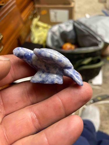This item is a small, hand-carved animal figurine depicting a bird in flight or a perched position, likely representing an eagle or hawk. The piece is crafted from sodalite, a chloric sodium aluminum silicate mineral, characterized by its distinct mottled pattern of royal blue, denim blue, and white calcite inclusions. The figurine measures approximately 1.5 to 2 inches in length. The craftsmanship features stylized, smooth-carved wings and a blocky base, indicating it was likely produced as a decorative gemstone 'pocket stone' or souvenir. The surface shows a high-gloss polished finish, though close inspection reveals minor surface abrasions and natural internal fractures typical of semi-precious stone carvings. There are no visible maker's marks or signatures, suggesting a mass-produced artisanal origin, frequently associated with lapidary workshops in Brazil or South Asia from the late 20th century to the present. The condition appears fair to good, with some dulled edges on the beak and wings that may indicate handling wear. The stone's color saturation is vibrant, which is a key quality indicator for sodalite specimens.