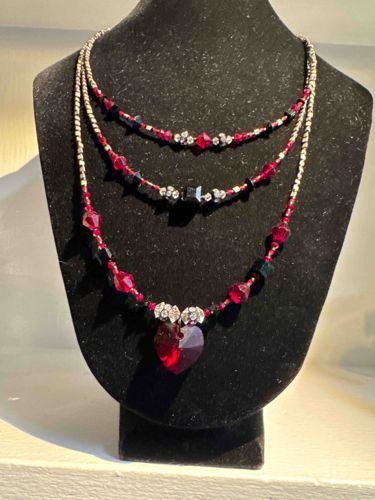 Triple-Strand Red and Black Crystal Heart Necklace