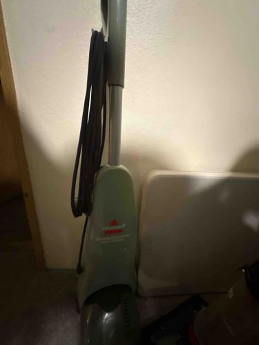 This is a Bissell QuickSteamer Multi-Surface upright carpet and hard floor deep cleaner. The unit features a lightweight, slim profile construction predominantly made of sage green and grey injection-molded plastic. It includes a silver-toned metal extension handle for structural rigidity. The front housing clearly displays the 'Bissell' logo in red and the 'QuickSteamer' branding in white text. Physically, the machine is equipped with a black rubberized power cord which is currently wrapped around the integrated cord hooks on the rear handle. The lower portion of the unit contains a translucent grey water/collection tank, allowing the user to monitor fluid levels. The design is characteristic of domestic cleaning appliances from the early-to-mid 2000s, designed for quick spill cleanup rather than heavy-duty industrial use. Its condition appears used but functional; there are visible scuffs on the lower plastic housing consistent with contact against furniture and baseboards. No major structural cracks are visible in the photograph, though the lack of a cleaning pad or brush roll view prevents a full mechanical assessment. The craftsmanship reflects typical consumer-grade mass manufacturing with snap-fit assemblies and recessed screw ports.