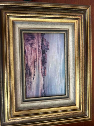 This item is a small-format landscape painting attributed to the renowned Australian artist Kenneth Jack (1924–2006). The artwork depicts a rural or outback scene, featuring humble architectural structures, likely farm buildings or sheds, situated alongside a dirt track or dusty clearing. The palette is dominated by muted, earthy tones of ochre, mauve, sienna, and cool blues, creating an atmospheric, somewhat melancholic light consistent with Jack's documentation of the evolving Australian landscape. The brushwork appears deliberate and textural, capturing the arid environment and weathered surfaces of the buildings. The piece is housed in an ornate, multi-tiered composite frame with a gold-leaf or gilt finish. The frame includes a linen-textured inner slip or 'liner' in a pale, neutral tone that provides visual depth and separates the art from the heavier golden molding. The outermost frame edge features a classic fluted pattern. Condition-wise, the frame shows minor signs of age-related wear including surface dust and slight abrasions to the gilt. The painting itself appears well-preserved within the frame, showing no immediate signs of flaking, significant fading, or canvas undulation, though it may benefit from a professional cleaning if surface grime is present. Kenneth Jack was a master of many mediums, including watercolor and acrylic; this particular piece showcases his skill in capturing the stillness and vastness of the Australian continent, likely dating from the mid-to-late 20th century.