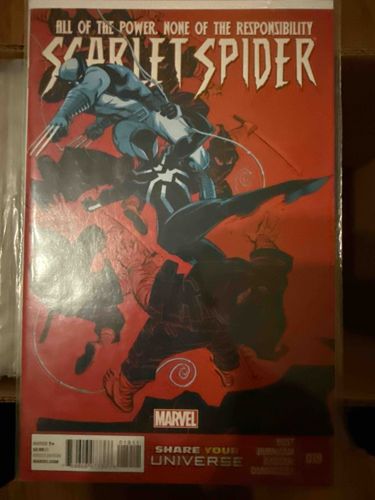 This is a standard-sized modern age comic book, Scarlet Spider Vol. 2 #18, published by Marvel Comics with a cover date of August 2013. The front cover features dynamic artwork by Ryan Stegman, depicting Kaine (Scarlet Spider) and Wolverine in a combat pose against a vibrant red background. The tagline 'ALL OF THE POWER. NONE OF THE RESPONSIBILITY.' is printed at the top in white lettering. The Marvel logo, price point ($2.99), and barcode are clearly visible at the bottom. This issue is part of the 'Sibling Rivalry' crossover event with Superior Spider-Man Team-Up. The comic appears to be in a protective plastic sleeve (polybagged or boarded), which suggests collectibility. From the visual evidence, the colors remain sharp and the cover displays high gloss. There are no major visible creases, color breaks, or spine rolls, though minor corner blunting may be present near the top-left edges. The manufacturing indicates high-quality modern offset lithography on semi-gloss paper stock. It represents the Modern Age of comics and is a key issue for fans of the Kaine Parker iteration of the Scarlet Spider character.