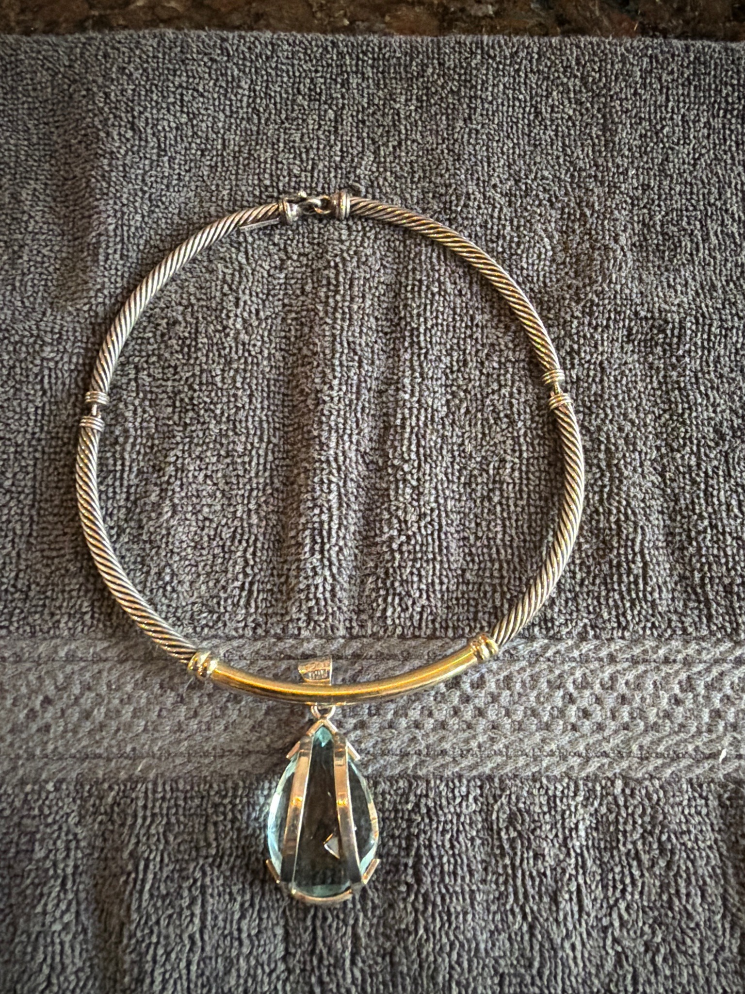 David Yurman Sterling Silver and 14k Gold Cable Classic Collar Necklace with Blue Topaz Pendant
