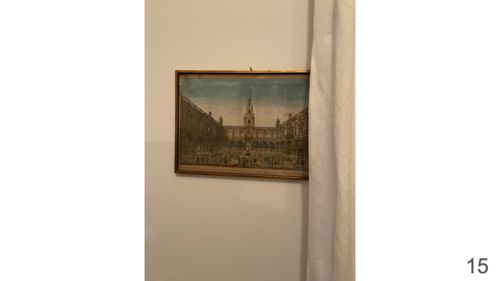 This item is a framed landscape artwork, specifically a veduta (view) depicting the Piazza San Marco in Venice, Italy. The composition features a central view of the piazza with the Basilica San Marco and its campanile rising in the distance, flanked by the symmetrical Procuratie buildings on either side. Historically, these scenes were popular as souvenirs for travelers on the Grand Tour. The physical item consists of a medium-sized horizontal print, likely an etching or engraving, that has been hand-colored with a palette dominated by muted blues in the sky and sepia tones for the architectural structures. It is housed in a simple, gold-painted or gilded wooden frame with a slim profile. There is notable evidence of age, particularly yellowing or foxing of the paper substrate, which is a common characteristic for pieces dating to the late 18th or 19th centuries. The coloration appears somewhat faded, suggesting significant light exposure over time. The frame shows minor surface wear and small abrasions consistent with mid-range decorative art of its era. While no specific maker's mark is visible from this distance, the perspective and execution are representative of the school of Venetian view-painters, such as Canaletto or Guardi, though this is likely a later print derivative of those masters. The craftsmanship indicates a quality decorative piece intended for domestic interior display.