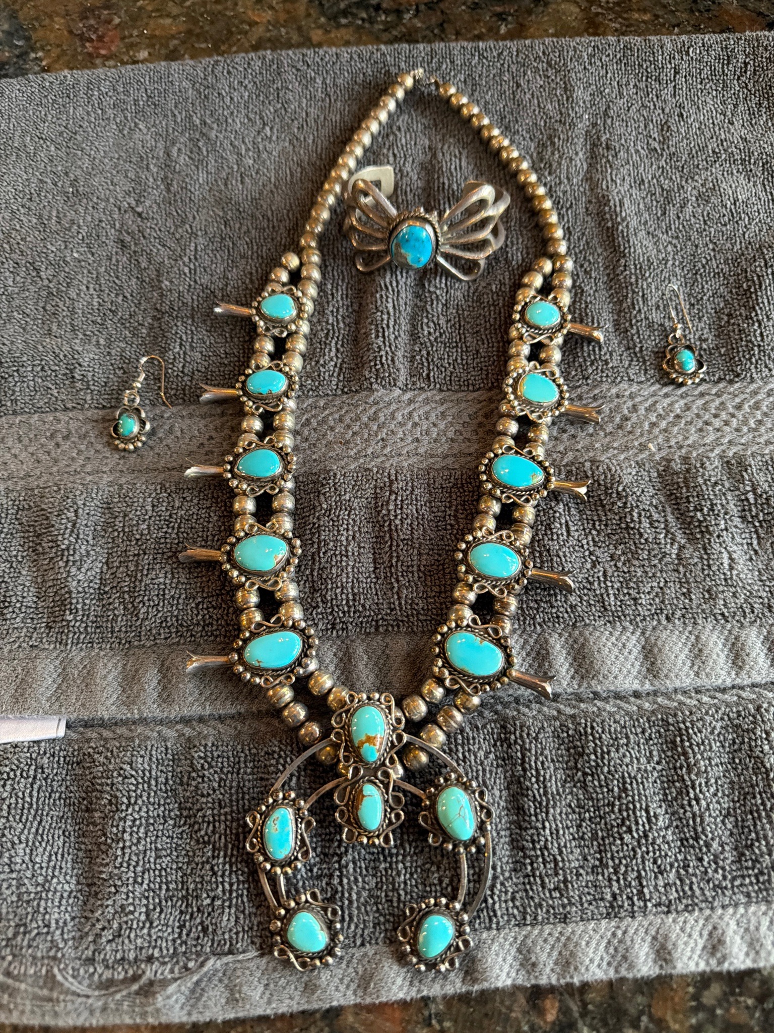 Vintage Navajo Squash Blossom Necklace Set with Bracelet and Earrings