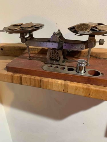 This is a vintage laboratory-style analytical balance scale, likely manufactured by Henry Becker or Central Scientific in the early to mid-20th century. The scale is mounted on a solid rectangular wooden base, which features an integrated metal weight block containing several milled apertures for cylindrical brass or steel weights; one polished metal weight remains in situ. The primary structure is composed of patinated metal, possibly steel and brass, with a central column featuring a distinctive openwork 'K' or 'B' monogram logo. The balance beam is equipped with a graduated scale, allowing for precise measurement via a sliding poise. Two circular metal pans are balanced on the arms, currently shown holding a variety of international coins. The condition shows signs of significant age and use, including overall surface patina, dust accumulation, and some minor oxidation on the metal components. The wooden base exhibits minor scuffing and finish wear. Several weights from the integrated holder are missing. Despite the wear, the mechanical linkages appear intact, representing high-quality industrial craftsmanship typical of academic or scientific instrumentation from the 1920s-1950s.
