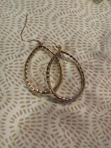 This is a pair of contemporary gold-tone fashion earrings featuring a teardrop or pear-shaped hoop design. The earrings are constructed from a lightweight metal base, likely brass or zinc alloy, with a polished yellow gold-colored plating. A defining characteristic of these pieces is the textured, hammered finish along the outer surface of the hoop, which creates multifaceted reflections when caught by the light. The hoops are suspended from matching 'fishhook' or shepherd hook ear wires, which are attached via small jump rings. The construction suggests mass-market fashion jewelry rather than fine jewelry, as there are no visible hallmarks for precious metals like k-karat gold or sterling silver. The condition appears to be very good with no visible tarnish, pitting, or loss of plating, suggesting they are relatively modern, likely produced within the last 5-10 years. The teardrop shape is a classic boho-chic style element that remains popular in casual jewelry collections. The earrings measure approximately 1.5 to 2 inches in length, providing a significant visual presence without excessive weight.