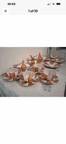 This is a distinctive Art Deco porcelain tea service featuring a bold geometric pattern. The set includes a teapot, a lidded sugar bowl, a creamer, and multiple cups with matching saucers. The design is characterized by alternating vertical panels of vibrant orange and crisp white, separated by thin black or dark brown linework. The shapes are highly stylized and angular, reflective of the 1920s-30s aesthetic, with pointed finials on the lids and sharp, geometric handles. The saucers echo the radial burst pattern from the center. The ceramics appear to have a glossy glaze, which enhances the saturated color of the orange panels. Based on the silhouette and motif, this style is closely associated with European ceramic houses such as Clarice Cliff or Shelley, or potentially Japanese lusterware export porcelain from the same period. The condition appears fair to good from a distance, though some glazing inconsistencies and minor shelf wear on the footed bases are expected given the age. The high-contrast palette and architectural forms make this an excellent example of interwar decorative arts. No maker marks are visible in the primary image, but such sets often feature stamped identifiers on the base indicative of 'Hand Painted' or country of origin details.