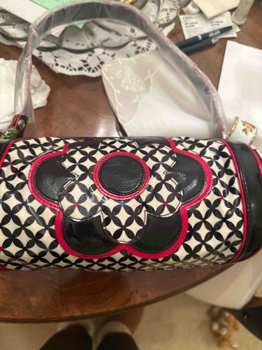 This is a Vera Bradley shoulder bag featuring a cylindrical barrel silhouette. The piece is constructed with a patent finish or laminated fabric exterior, showcasing a high-contrast 'Night and Day' pattern. The design consists of a black and white geometric floral lattice background, accented by a large, centralized quatrefoil or flower appliqué. This central motif is outlined in a vibrant fuchsia pink piping and features glossy black patent segments and a circular center. The bag includes a matching black shoulder strap, which is currently encased in protective factory plastic, suggesting an unused or 'New with Tags' condition. The ends of the barrel are capped with solid black patent material, also trimmed with pink piping. The construction appears sturdy, characteristic of Vera Bradley's mid-2000s to early 2010s collections when the brand experimented more heavily with patent and non-quilted materials. Handbag craftsmanship details include precise topstitching and smooth piping transitions. No visible wear, scuffing, or foxing is present in the image.