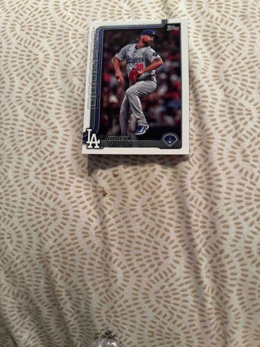 This is a standard 2.5 by 3.5 inch modern baseball trading card from the 2024 Topps Series 1 collection, featuring relief pitcher Kirby Yates. The player is depicted in mid-motion on the mound, wearing the home gray Los Angeles Dodgers uniform with a red glove and blue cap. The card design utilizes a white border with a modern, high-gloss finish typical of contemporary Topps releases. Primary colors include Dodger blue, silver, and white. The front includes the 'Topps' brand logo in the upper right, the 'LA' team logo in the lower left, and the player's name 'Kirby Yates' at the bottom center. The left side of the frame features a stylized vertical graphic element containing the team name 'Dodgers'. From the visual assessment, the card appears to be in near-mint to mint condition, showing sharp corners, clean horizontal and vertical centering, and crisp edges without visible fraying or chipping. There are no obvious surface scratches, indentations, or print lines. The high-quality cardstock and UV coating indicate a mass-produced modern collectible with consistent manufacturing standards. This is a base-tier card from the flagship 2024 set.