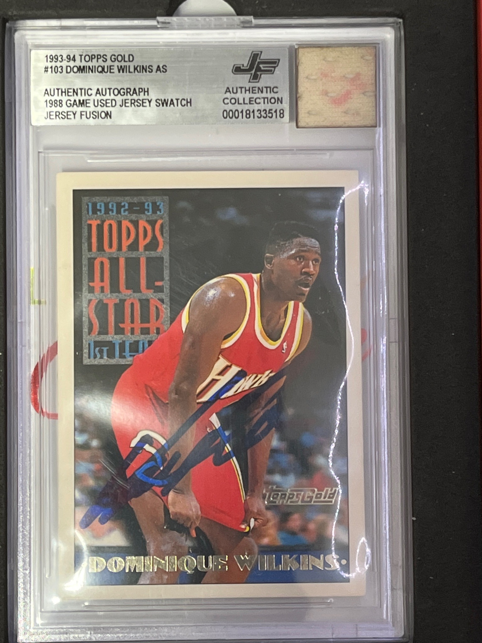 This is a 1993-94 Topps Gold #103 Dominique Wilkins All-Star First Team trading card that has been professionally encapsulated by Jersey Fusion. The item features several distinct layers of collectibility: an original vintage card, an authentic on-card autograph, and an integrated game-used relic. The card is encased in a protective plastic slab with a silver identification header. The header confirms the item details, including the 'Jersey Fusion' brand name and a specific serial number (00018133518). A key feature is the visible 1988 game-used jersey swatch located in a top-right window of the case insert. The card itself displays Wilkins in his classic Atlanta Hawks red uniform, and it is signed across the front in blue ink. The autograph is bold and centered, though the card shows some slight surface wear typical of handled vintage stock. The 'Topps Gold' foil stamping is crisp in the lower right corner. This multi-asset collectible combines technical card grading aesthetics with the secondary market authentication of both the signature and the fabric swatch, making it a unique piece for sports memorabilia collectors focusing on the NBA's 50th Anniversary season era.