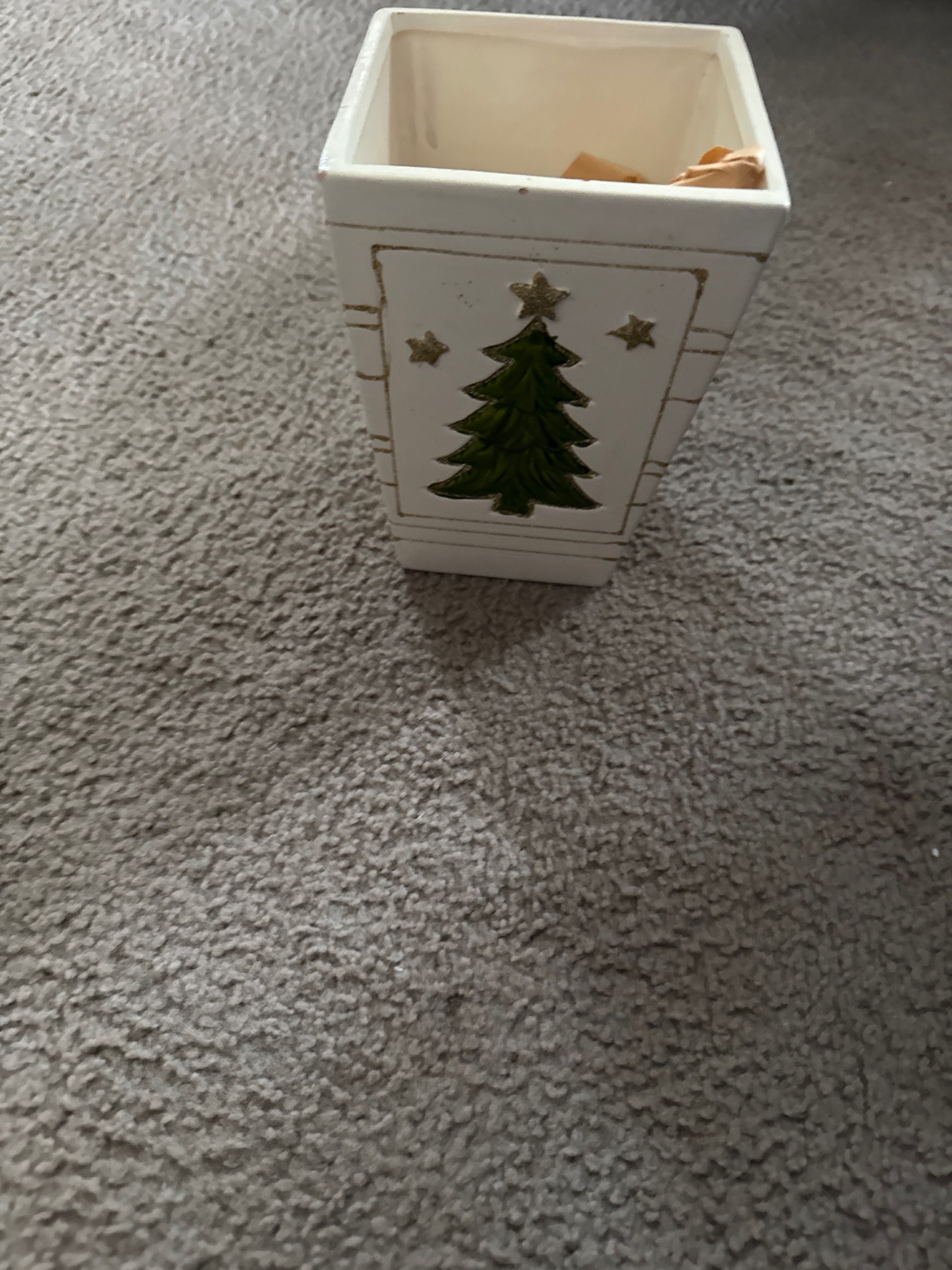 This item is a decorative tapered square ceramic vessel, likely designed as a holiday-themed planter or cachepot. The exterior features a creamy off-white or light ivory glazed finish. The primary focal point is a central molded relief of a Christmas tree in dark forest green, accented with gold-toned glitter. The tree is flanked and topped by small, five-pointed gold stars. The design is framed with a thin, metallic gold-painted rectangular border that shows deliberate hand-painted imperfections. Architecturally, the piece is wider at the top than at the base, creating a classic planter silhouette. The sides feature recessed horizontal bands, or 'corrugations,' that wrap around the corners, adding structural visual interest. Regarding condition, there are visible surface scuffs near the upper left rim and minor debris inside the vessel. The gold detailing appears to have some slight wear consistent with seasonal use. This piece likely dates from the late 20th century to early 21st century and is typical of mass-produced holiday home decor from retailers like Hallmark or similar gift boutiques. The interior is glazed to allow for holding water or damp soil, though it is currently shown containing paper or filler material.