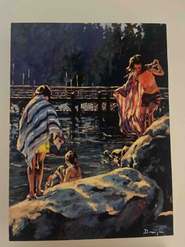 This is a contemporary impressionist oil or acrylic painting on what appears to be a wrapped canvas or board. The composition depicts three children playing near the water at dusk or in deep shade. One child in the foreground is wrapped in a blue-striped towel, another is seated further back, and a third child on the right is seen handling a pink-striped towel. The background features a wooden pier or dock structure and dark, silhouetted foliage. The color palette is dominated by deep blues and purples in the shadows, contrasted with sharp, warm highlights of yellow, orange, and white suggesting a low sun. The brushwork is energetic and painterly, particularly on the rocky foreground. A cursive signature is visible in the lower right-hand corner, though the specific name is difficult to transcribe without closer inspection. The artwork appears to be in good physical condition with no visible cracking, staining, or surface abrasions. The style suggests a late 20th to early 21st-century production, characterized by a focus on light reflecting off water and textiles. The level of craftsmanship indicates a professional hand with good control over values and atmospheric perspective.