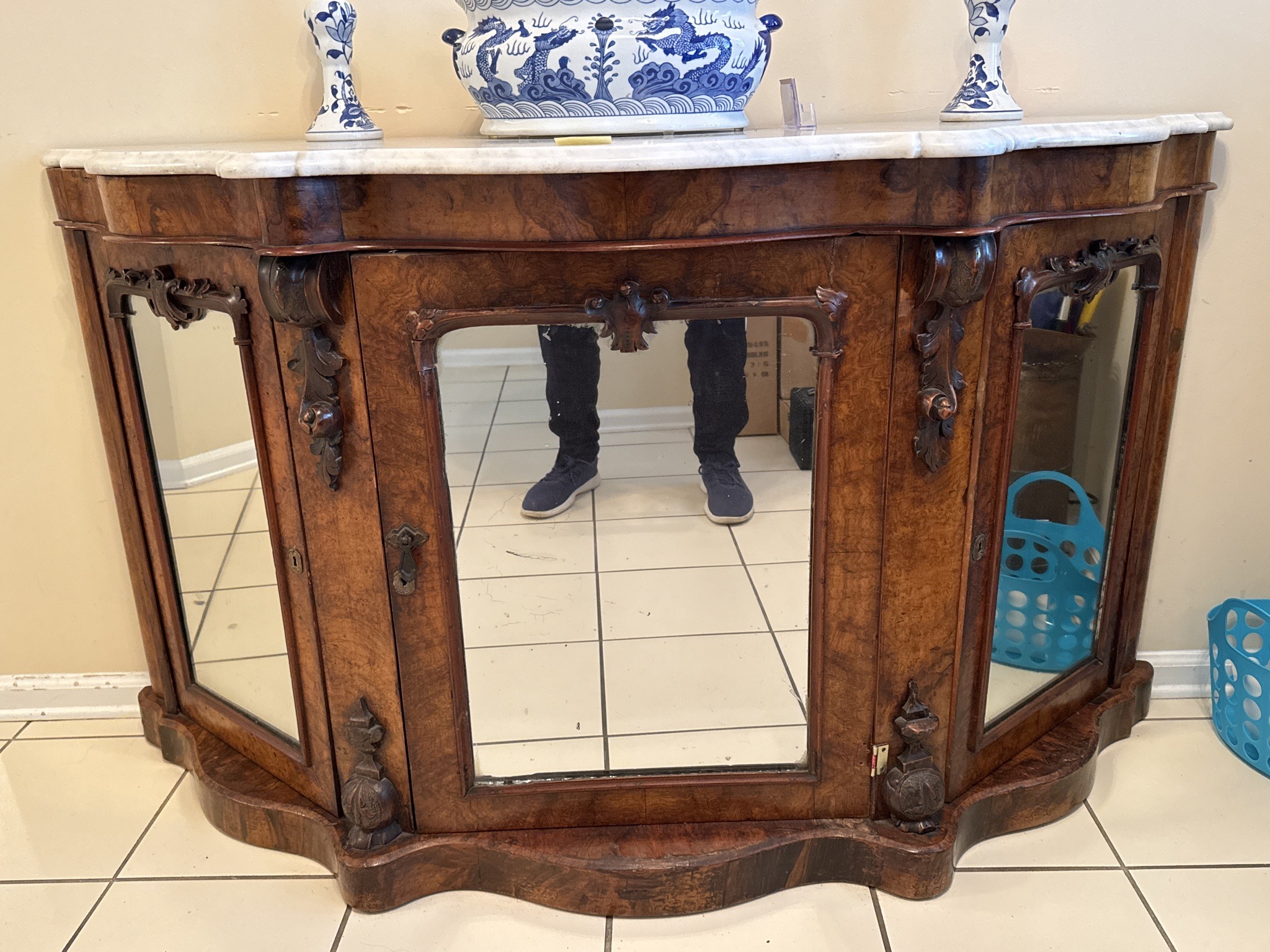 Victorian Walnut Burl Mirrored Credenza with Marble Top