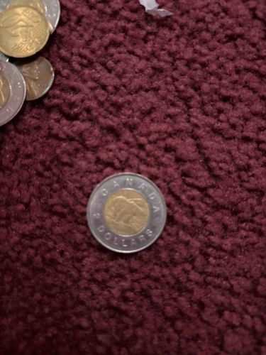This is a standard Canadian 2-dollar bimetallic coin, commonly referred to as a 'Toonie'. The coin features a distinct dual-tone construction with a golden-colored inner core made of aluminum bronze and a silver-colored outer ring made of nickel-plated steel. On the reverse side shown, the central motif depicts a polar bear standing on an ice floe, which is the standard design by artist Brent Townsend first introduced in 1996. The outer ring is inscribed with the word 'CANADA' along the top curve and '2 DOLLARS' along the bottom. The coin appears to be in circulated condition, displaying visible surface abrasions, minor scratches, and a dulling of the original mint luster, consistent with general everyday use. There is a noticeable patina and grime accumulation in the recessed areas of the lettering and the central design. While the date is not clearly visible in this specific orientation, this style was minted from 1996 through the early 2010s before the introduction of newer security features like laser marks. The strike quality is typical for business-strike circulation currency, exhibiting clear but worn relief on the bear's form and the surrounding topography.