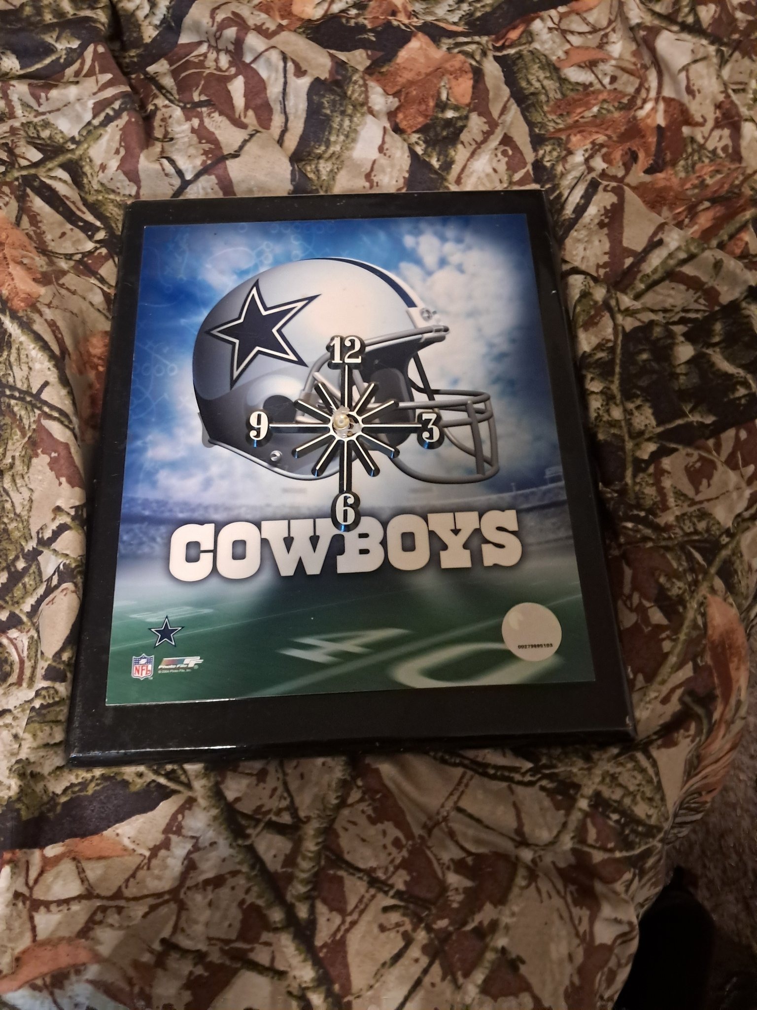 This is a rectangular wall plaque clock featuring the Dallas Cowboys NFL team. The item measures approximately 10 by 12 inches and is constructed of a high-gloss printed graphic mounted onto a black Medium Density Fibreboard (MDF) or wooden base. The background graphic depicts a professional Dallas Cowboys silver helmet with the iconic blue star logo, set against a blue sky over a football field with 'COWBOYS' text at the bottom. The clock mechanism is centrally mounted with a unique eight-pointed star-shaped hand assembly, though it appears to be missing its actual hour and minute hands, leaving only the decorative star piece and central spindle. The numerals 12, 3, 6, and 9 are integrated into this star motif. Indicators of authenticity include the official NFL logo, a 'Photo File' logo, and a circular holographic NFL sticker with a serial number located in the bottom right corner. The printed copyright date small at the bottom left indicates a manufacturing period around 2004. In terms of condition, there is visible surface wear including minor scuffing on the black edges and the aforementioned missing clock hands, which significantly affects its functionality as a timepiece but maintains its decorative collectible value.
