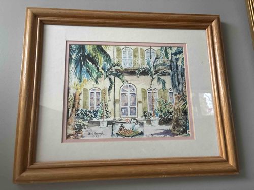This item is an original watercolor painting on paper, dated 1983 and signed by the artist, Bill Burrough. The artwork depicts a lush, tropical courtyard scene, likely in a colonial or Caribbean architectural style, featuring arched windows, palm trees, and a central fountain or planter. The color palette is vibrant, utilizing shades of teal, forest green, ochre, and soft lavender to create a sense of light and shade. The execution style is loose and impressionistic, characterized by fluid brushstrokes and visible pencil underdrawings. The piece is professionally matted with a dual-layered matting (off-white over a thin pink accent border) and housed in a multi-edged, honey-toned wooden frame. The signature 'Bill Burrough’ and the date '© 83' are clearly visible in the lower left corner. Dimensions appear to be approximately 11x14 inches for the sight area. The condition of the artwork itself appears excellent with no visible foxing or fading, though the frame shows some minor surface scuffs and wear along the bottom edge, consistent with age and typical display history. The craftsmanship of the watercolor indicates a skilled hand, particularly in the handling of transparency and the layering of tropical foliage.