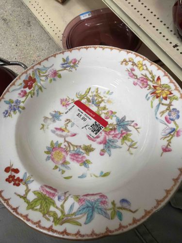 This is a vintage Mason's Ironstone soup plate or wide-rimmed bowl, likely dating from the mid-20th century, featuring a vibrant floral transferware pattern with hand-painted polychrome accents. The piece is constructed from heavy, durable ironstone ceramic with a creamy white glaze. The central motif depicts a stylized flowering tree or shrub in the Chinoiserie style, utilizing a palette of pink, blue, yellow, and green. This central design is mirrored by four distinct floral sprays around the wide, scalloped rim. A delicate, burnt-orange geometric and scroll border finishes the outer edge. While no maker's mark is visible from this angle, the style is characteristic of English ironstone manufacturers like Mason's or Ashworth. Regarding condition, there is visible crazing throughout the glaze, which is typical for ironstone of this age. A retail thrift store sticker is applied directly to the center, which may leave adhesive residue. There are minor signs of surface wear from stackings and use, but no large chips or cracks are immediately apparent from the top view. The craftsmanship displays the high-quality transfer and hand-enameling techniques that made English ironstone popular worldwide.