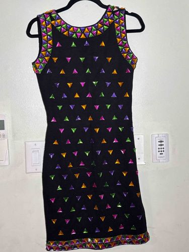This is a vintage designer garment from A.J. Bari, specifically a sleeveless, form-fitting black mini dress. The dress is characterized by its bold and vibrant embellishment, featuring numerous oversized, triangular-cut acrylic or glass jewels in a palette of emerald green, royal purple, and amber yellow. These jewels are meticulously arranged: a dense, double-row border lines the scoop neckline and sleeveless armholes, as well as the straight hemline. The main body of the dress is decorated with a scattered, geometric 'rain' of these triangular stones, creating a high-contrast, maximalist aesthetic. The base fabric appears to be a heavy black crepe or wool-blend jersey, which provides the necessary structural integrity to support the weight of the dense embellishments. The construction reflects the high-quality craftsmanship typical of the 1980s or early 1990s cocktail attire, with clean lines and a sheath silhouette. Visible condition appears good with the primary structural elements intact, though such pieces often require checking for loose threads or missing stones due to the weight of the faceted jewels. This item reflects the 'bold luxury' style period of the late 20th century, making it a desirable piece for vintage collectors and high-end resale markets.