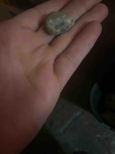 This is a small, water-worn or mechanically tumbled stone resting in the palm of a hand. The specimen measures approximately 1.5 to 2 centimeters in length. Its physical characteristics include a semi-translucent quality with a predominantly muted gray or olive-drab base color. A defining feature is the irregular, light-colored 'mossy' or dendritic-like inclusions visible just beneath the surface, suggesting a composition of cryptocrystalline quartz, such as chalcedony or a common agate. The stone's shape is irregular and sub-rounded, typical of natural river-worn tumbling or a light polish from a rock tumbler. The surface appears matte to semi-glossy, showing no specific maker's marks or human craftsmanship, placing it in the category of a raw geological specimen. There are visible surface fractures or internal veining that reflect light, which are natural structural features rather than damage. No signs of post-extraction carving or aesthetic refinement are noted. The age of the geological formation could be millions of years, though its collection and processing period is indeterminate. The specimen lacks specialized finishing but demonstrates natural aesthetic appeal through its internal patterns.