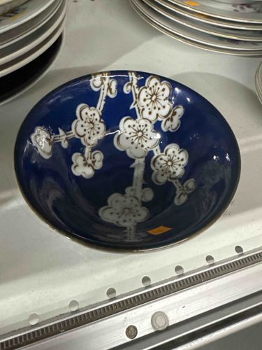 This is a circular porcelain bowl featuring a deep cobalt blue glazed interior and exterior. The interior is decorated with a slip-trailed or hand-painted white plum blossom (ume) motif, a classic Japanese design symbolising resilience and the arrival of spring. The blossoms are accented with thin gold-tone or brownish outlines, providing a crisp contrast against the saturated blue background. Based on the size relative to the surrounding shelving, it appears to be a medium-sized serving or cereal bowl. The construction is uniform with a slightly tapered profile. No visible maker's marks are shown in the primary view, but the style is characteristic of mid-20th-century Japanese export porcelain, such as Arita or Imari-style wares. The condition appears fair to good; there are no large chips or cracks visible on the rim, although there is a small yellow price tag adhered to the bottom interior which may leave residue upon removal. The glaze exhibits a high-gloss finish typical of modern kiln firing. There are minor reflections on the surface suggesting the glaze is smooth and well-preserved without significant crazing or surface abrasion.