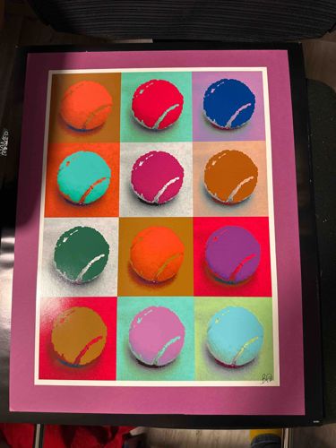 This item is a contemporary photographic print featuring a grid of twelve tennis balls, rendered in a diverse palette of vibrant, saturated colors. The composition is arranged in a 3x4 grid, with each individual ball set against a contrasting solid-colored square background, creating a high-energy visual effect reminiscent of the mid-20th century Pop Art movement, specifically referencing the style of Andy Warhol. The colors include shades of neon orange, hot pink, deep blue, turquoise, magenta, ochre, forest green, and violet. Each tennis ball retains its characteristic fibrous texture and curved seam detail, highlighted with white or high-contrast tones to provide a sense of three-dimensionality against the flat-colored backgrounds. The print is mounted within a wide magenta or fuchsia-colored mat board, which is further encased in a thin black frame. A small, stylized signature or insignia is visible in the lower right-hand corner of the print's white border, though the specific artist is not immediately identifiable. The piece appears to be in good overall condition with no visible fading, moisture damage, or significant abrasions to the print surface. The framing is modern, suggesting a late 20th or early 21st-century production date.