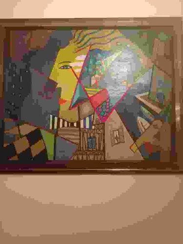 This is a contemporary acrylic painting on canvas by the French artist Patricia de Boysson. The artwork features a complex, multi-faceted composition that merges elements of Cubism and Surrealism. The primary subject appears to be a stylized feminine face, rendered with a bright yellow profile, a single distinct eye, and red lips, which then dissolves into a geometric lattice of abstract shapes and symbols. The color palette is vibrant and diverse, utilizing primary tones of yellow, blue, and red alongside earthy ochres, greens, and blacks. Notable patterns including checkerboards and vertical stripes are integrated into the lower sections of the work, suggesting architectural or interior elements. A prominent red 'X' or triangular motif intersects the center, creating a dynamic sense of movement. The painting is housed in a simple, dark-toned wooden frame that appears to be in good condition. The brushwork seems deliberate and crisp, indicative of a professional level of craftsmanship characteristic of de Boysson's late 20th to early 21st-century style. While the photographic quality is somewhat pixelated, the canvas appears taut with no visible signs of sagging, tearing, or significant pigment loss. The composition is well-balanced, utilizing hard-edge techniques to separate the various intersecting planes, creating a layered, psychological depth to the portrait.
