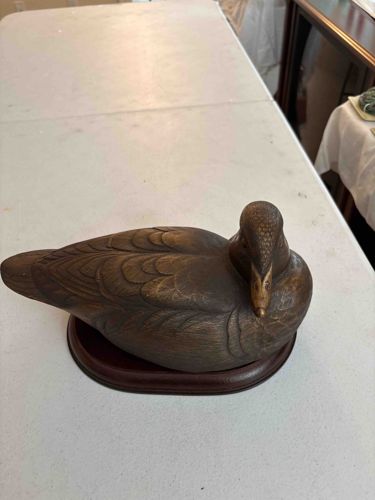 This item is a decorative waterfowl figurine, specifically a duck decoy, crafted in a resting position with the head turned sharply to the right. The piece is mounted on an oval, dark-toned wooden plinth base with a beveled edge, suggesting it is intended for display rather than field use. The body of the duck features intricate, hand-carved or molded textural patterns representing feathers, with a repeating scalloped motif across the back and wings. The coloration is a monochromatic deep bronze or dark umber tone, likely achieved through a stained wood finish or a cast resin material designed to simulate aged walnut. A subtle 'wash' or patina effect is visible in the recessed areas of the carving, providing high contrast and highlighting the plumage details. The head exhibits finer, cross-hatched feathering patterns, and the bill is rendered in a slightly lighter, antique gold or ochre shade, which appears to be applied paint or gilt. The condition appears excellent with minimal signs of handling; no major chips, cracks, or structural losses are evident from this angle. The craftsmanship suggests a mid-to-late 20th-century decorative piece, possibly a high-end giftware item from a manufacturer such as Duck's Unlimited or a similar wildlife artisan studio. The realistic anatomy paired with the stylized monochromatic finish indicates a piece designed for traditional library or study decor.